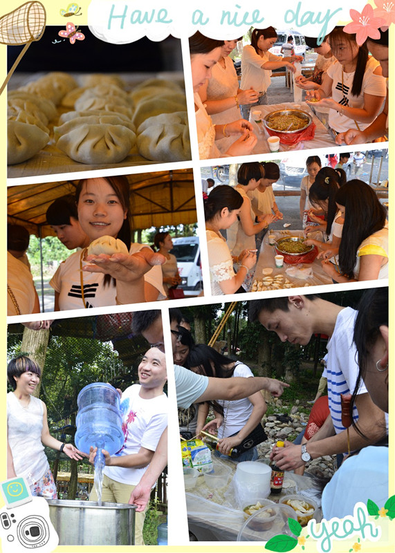 為了讓大家有個(gè)開心的午飯,一些同事積極幫忙搬水、搬水果和燒烤食材,心靈手巧的女同事們也現(xiàn)場包起了餃子,來自不同區(qū)域的人包出來的餃子也是各具風(fēng)采,有永康本地的傳統(tǒng)餃子,也有“花邊”餃子,看,連沙縣小吃的蒸餃也有。相對(duì)于女同事的“悠哉”,男同事也發(fā)揮了其特長,扛水、撿柴、生火,惹得大家紛紛點(diǎn)贊。