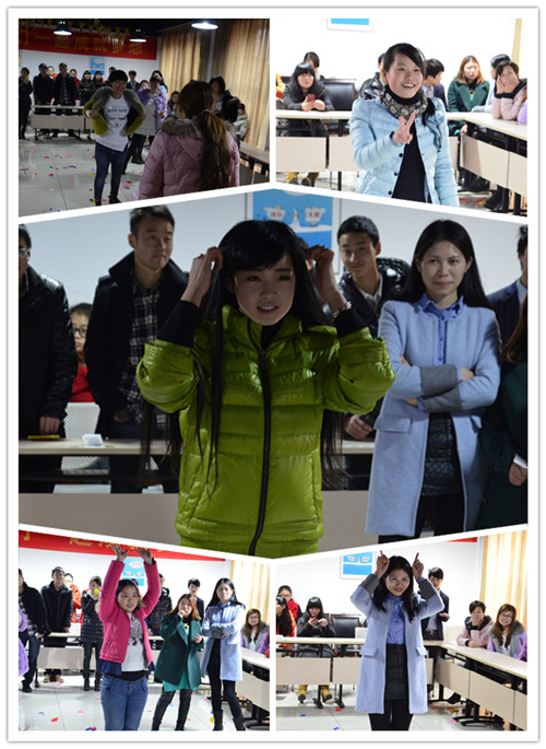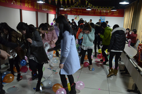陳總介紹,本次三八婦女節活動由兩個環節組成。第一環節是踩氣球,即所有參賽女員工兩兩結成一對,并各自挑選兩組氣球綁在腳上,待音樂聲起,盡力去踩破他組的氣球,與此同時要保護自己的氣球不被踩爆。4個氣球都被踩爆的人員則淘汰。最后剩下10位人員的時候,比賽進入第二環節。第二環節名稱為“你來比劃我來猜”。前一環節剩下的10位人員重新兩兩組合,共5組。每一組都會拿到3道題,第一題可以使用語言或者肢體動作進行描述,但是不能說出題目里的任一字眼,第二題和第三題只允許肢體語言進行演繹,出聲描述即被淘汰。在規定時間內,猜出數量多的隊取勝。獲勝的隊伍可是能拿到超級大禮——精美的黑陶瓷!